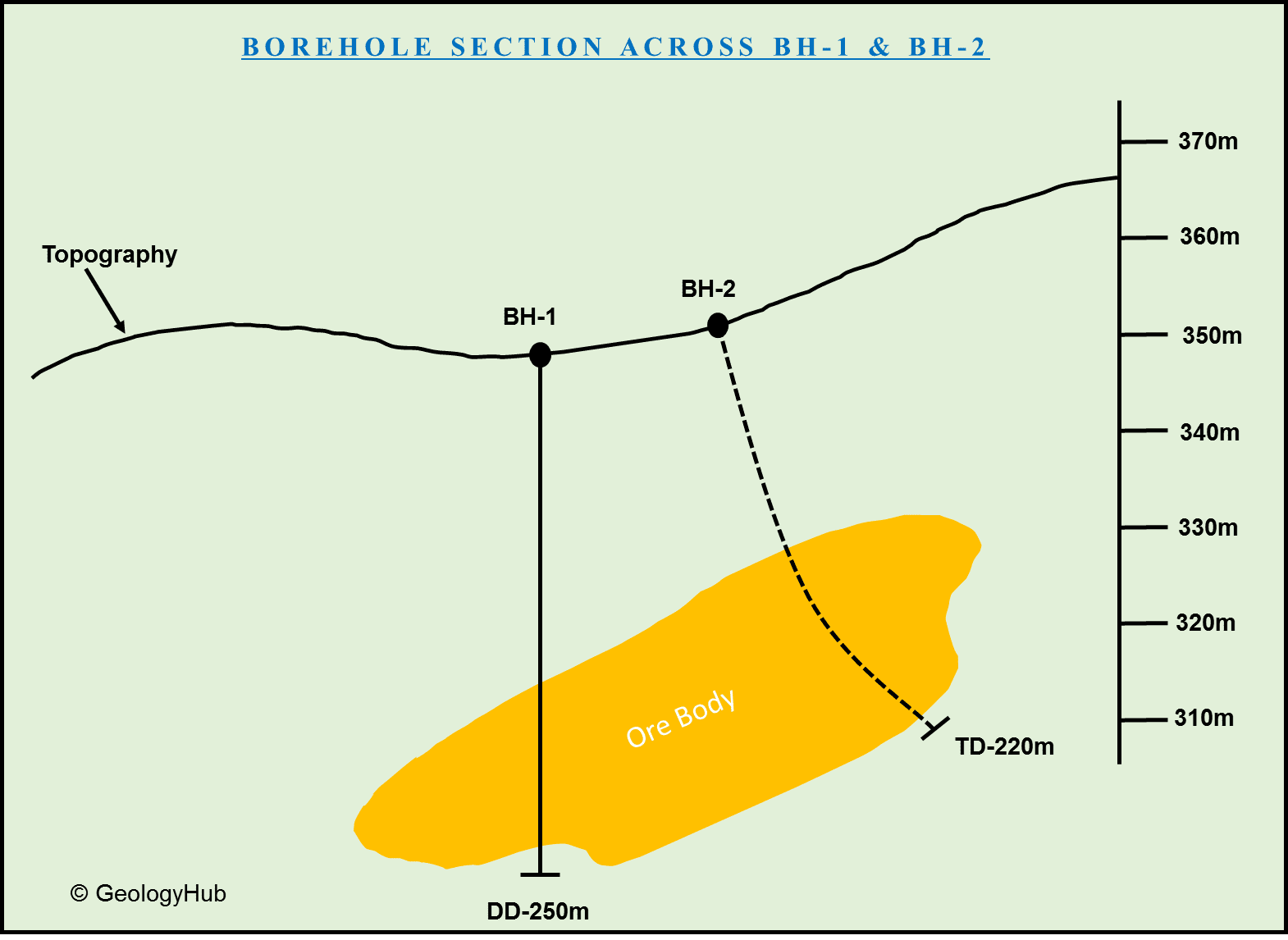 As an example, where the dip of a mineralised outcrop is not clearly visible usually two inclined boreholes are drilled from either side. But still, there are problems of exploration of ore bodies having a steep inclination or variable inclination on either side. In such cases sometimes same platform is used to drill a number of boreholes with different inclination after taking into account the possibility of deviation of the boreholes. Sometimes the surface features or topography is an important limitation for borehole planning. For example, the deep nalas or escarpments restrict the movement of drill rigs and in such cases, the planning of borehole needs special skills.